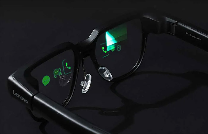 레노버 V1 스마트 안경은 렌즈 양쪽에 녹색으로 텍스트와 간단한 이미지를 표시하는 마이크로 LED 디스플레이를 탑재한 것이 특징입니다.