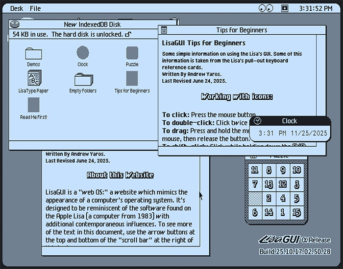 초기 매킨토시의 그래픽 인터페이스에 영향을 끼친 애플 리사 워크스테이션의 운영체제를 웹에서 경험하는 리사GUI(LisaGUI)가 등장했습니다.