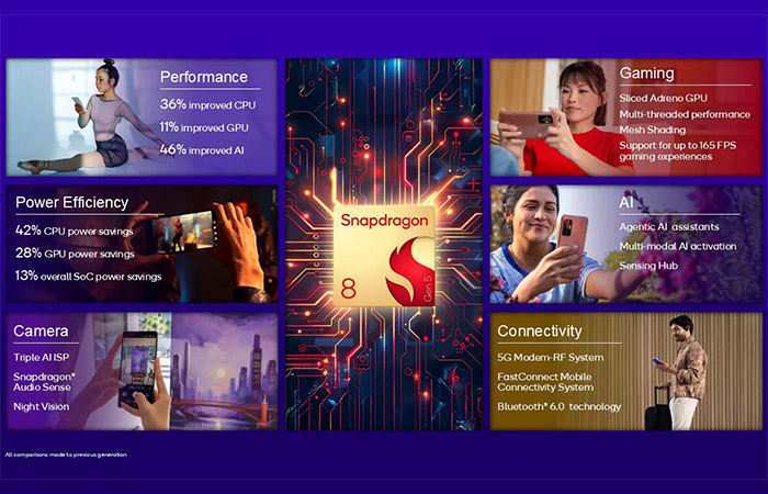 스냅드래곤 8 5세대 CPU는 스냅드래곤 8 엘리트 5세대의 오라이온 코어에 비해 클럭은 더 느린 2개의 프라임 코어(3.8GHz)와 6개의 퍼포먼스 코어(3.32GHz)로 구성됩니다.