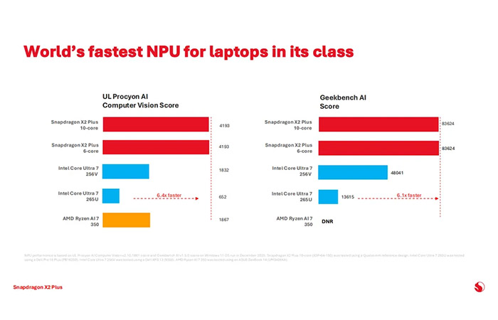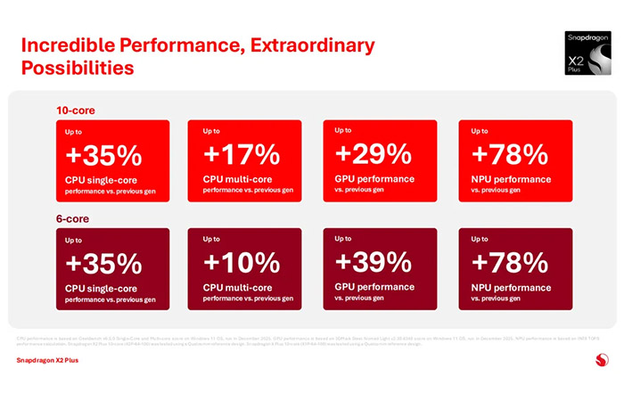 스냅드래곤 X2 플러스는 엘리트 버전보다 적은 코어를 갖췄으나 이전 세대 플러스 버전보다 긱벤치 6 기준 싱글 코어 성능을 최대 35% 향상시켰습니다.
