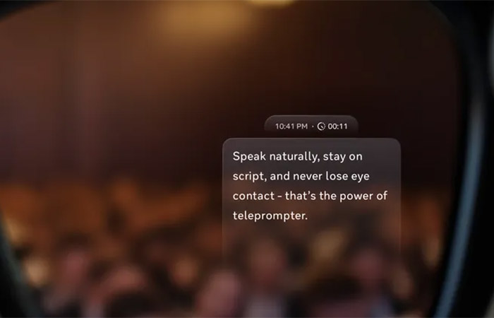 텔레프롬프터는 각 상황에 맞는 메모를 눈앞의 디스플레이에 표시하고 이용자가 착용하고 있는 뉴럴 밴드를 통해 다음 메모를 표시합니다.