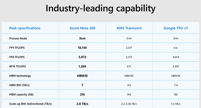 마이크로소프트의 데이터에 따르면 마이아 200의 FP8 성능은 아마존의 3세대 트레이니움(Trainium)보다 거의 두 배 높고, 구글 7세대 TPU보다도 약 10% 높습니다.