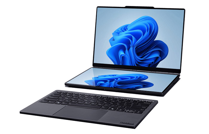 씽크북 모듈러 AI PC 콘셉트에 기본 키보드를 연결했을 때 모니터는 킥 스탠드를 활용해 확장 모니터로 쓸 수 있고, 키보드를 모니터로 대체하면 최대 19인치 크기의 듀얼 스크린 노트북으로 쓸 수 있습니다.