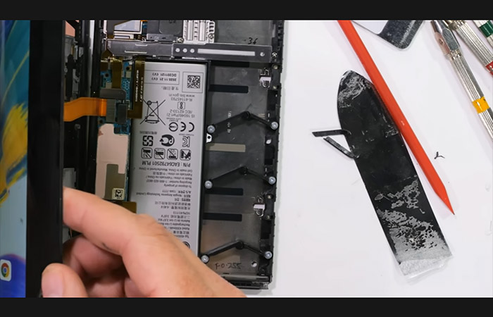 롤러블 구동을 위한 기계적 장치들이 내부 공간의 상당 부분을 차지하면서 메인보드 같은 핵심 부품은 그 틈새에 배치했고, 배터리도 물리적 간섭을 피하고 공간 효율을 극대화하도록 탑재했습니다.